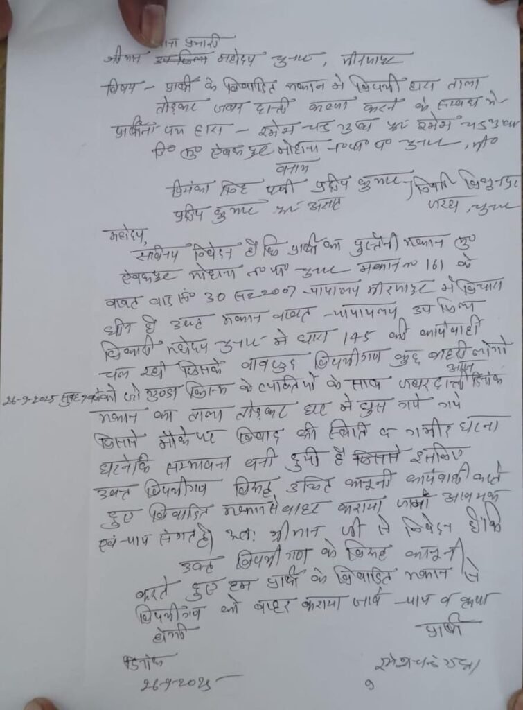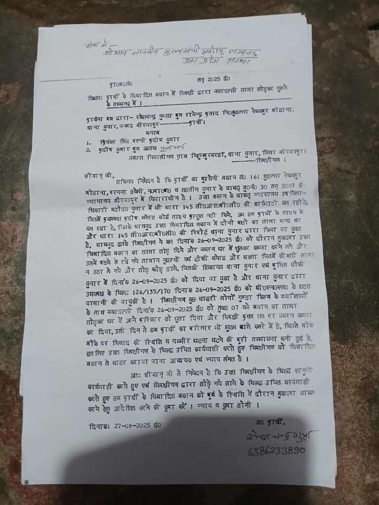 जनपद मिर्जापुर के कोतवाली चुनार अंतर्गत एबकपुर मोहना तहसील के पास का एक मामला प्रकाश में आया है। पीड़ित रमेश गुप्ता ने बताया कि हमारा एक पुश्तैनी मकान पीडीएनडी कॉलेज के ठीक सामने स्थित है जिसका न्यायालय सिविल कोर्ट में मुकदमा भी चल रहा है जिसमें लगभग 3 वर्षों से ताला बंद पड़ा था उसे विपक्षीगणों प्रदीप सिंह व सहयोगियों के द्वारा जबरन बिना किसी आदेश के दबंगई के बलबूते दुसरा ताला लगाकर कब्जा कर लिया गया।