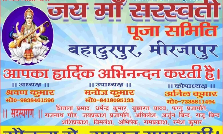 जिला मीरजापुर: मीरजापुर के भाईपुर क्षेत्र में शुक्रवार को विद्या की देवी मां सरस्वती की पूजा श्रद्धा, शांति व उल्लासपूर्ण वातावरण में संपन्न हुई। विभिन्न गांव, मोहल्लों, शिक्षण संस्थानों, कोचिंग सेंटरों सहित अन्य स्थानों पर मां सरस्वती की प्रतिमाएं स्थापित कर विधिवत पूजा-अर्चना की गई। पूजा पंडालों में श्रद्धालुओं की भीड़ उमड़ पड़ा। सुबह से ही पूजा पंडालों में भक्तिमय माहौल बना रहा। विशेष कर शिक्षण संस्थानों में विद्यार्थियों ने अपनी रचनात्मकता, कला व कौशल का परिचय देते हुए आकर्षक व सृजनात्मक ढंग से विद्या की देवी मां सरस्वती की प्रतिमाएं स्थापित कर श्रद्धापूर्वक पूजा अर्चना की। यह लोगों के लिए आकर्षण का केंद्र बना रहा।
